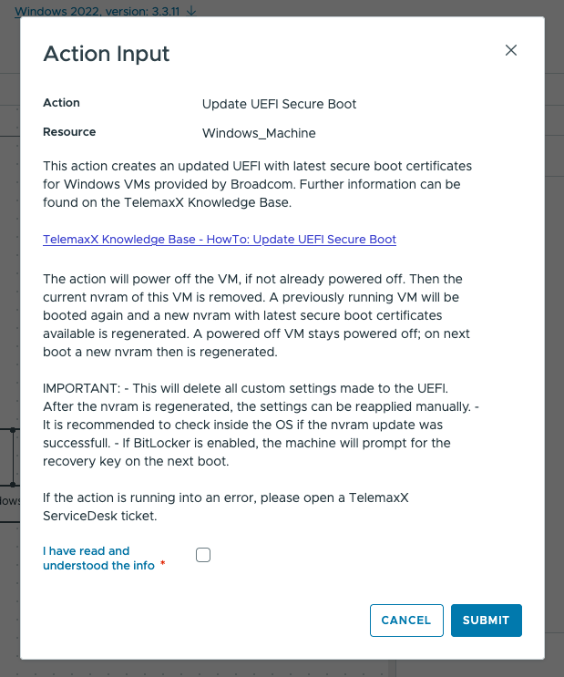 Die 2-Day-Operation Funktion "Update UEFI Secure Boot" unterstützt Sie beim notwendigen Update der Secure Boot Zertifikate für Windows VMs.