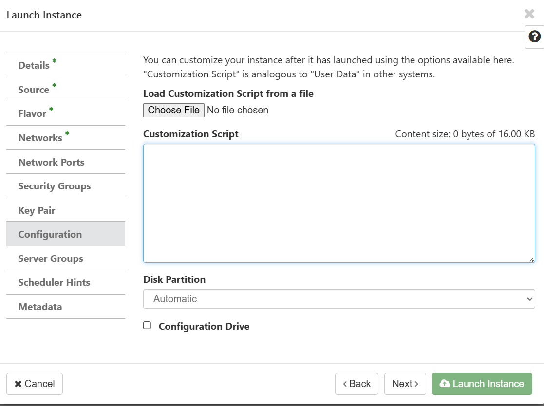 - Instanzname, Flavor (CPU/RAM/Disk)