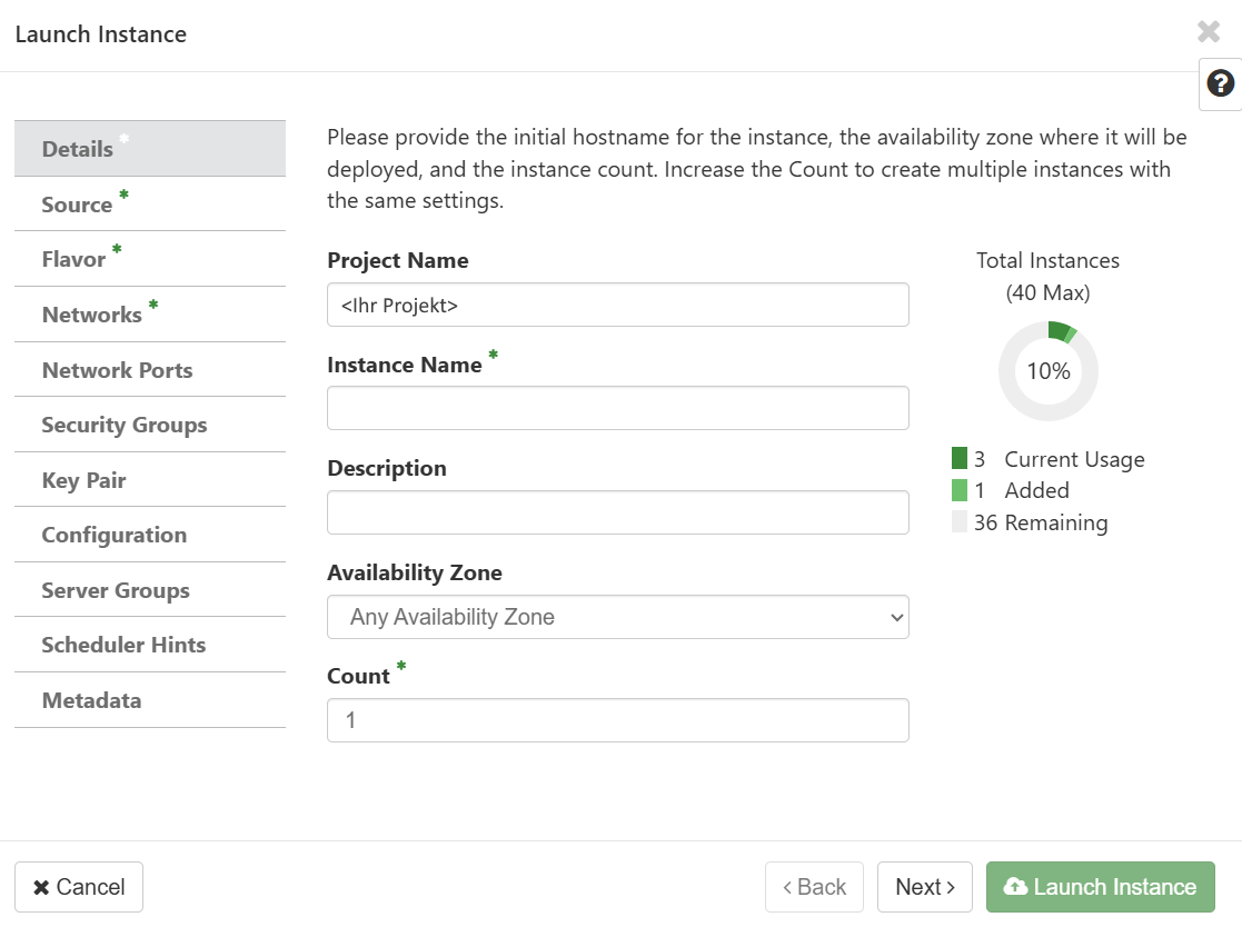 Horizon → Ihr Projekt → Compute → Instances → Launch Instance.