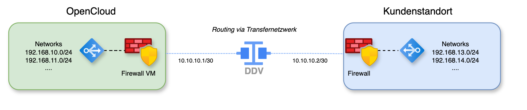 Eine Layer-2-Verlängerung (L2-Stretch) vom Kundenstandort in die OpenCloud ist nicht Bestandteil dieses Services. Die Kommunikation erfolgt stets über ein dediziertes Transfernetz, das als Punkt-zu-Punkt-Verbindung ausgelegt ist.