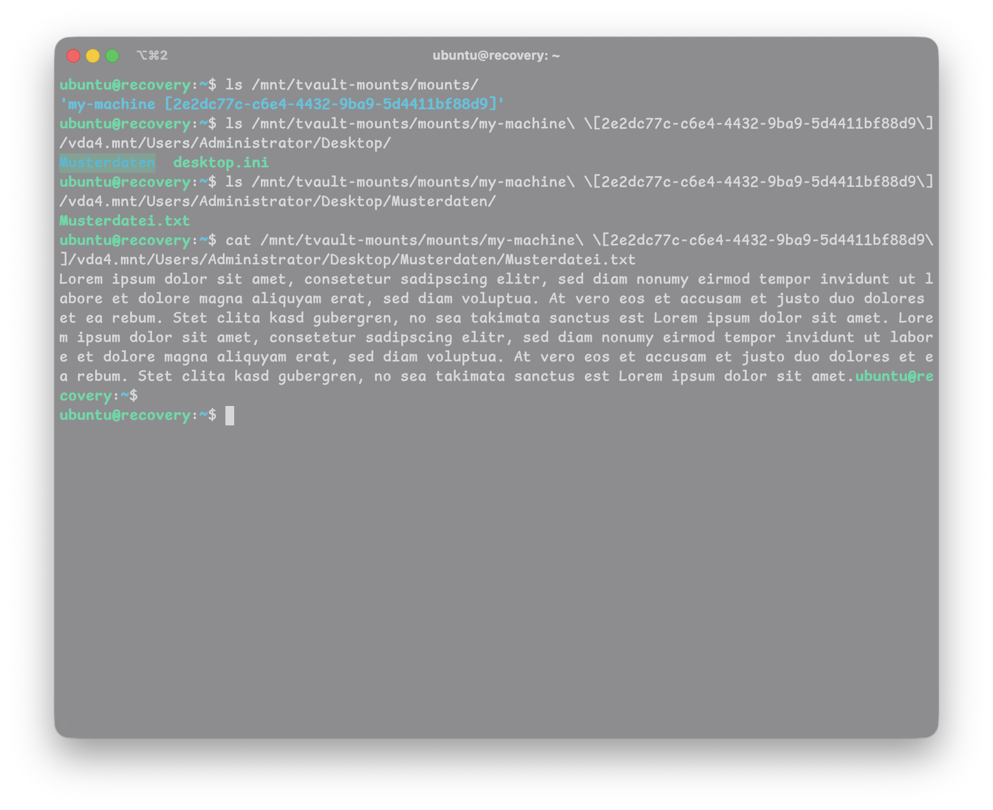 ) befindet sich dementsprechend unter /mnt/tvault-mounts/mounts/my-machine [2e2dc77c-c6e4-4432-9ba9-5d4411bf88d9]/vda4.mnt/Users/Administrator/Desktop/Musterdaten/Musterdatei.txt