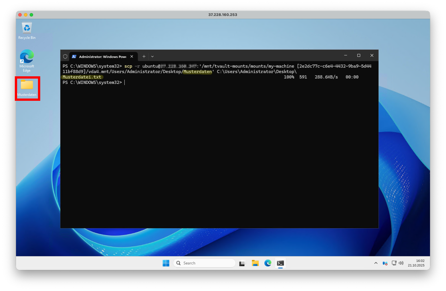 scp -r [email protected]:'/mnt/tvault-mounts/mounts/my-machine [2e2dc77c-c6e4-4432-9ba9-5d4411bf88d9]/vda4.mnt/Users/Administrator/Desktop/Musterdaten' C:\Users\Administrator\Desktop\