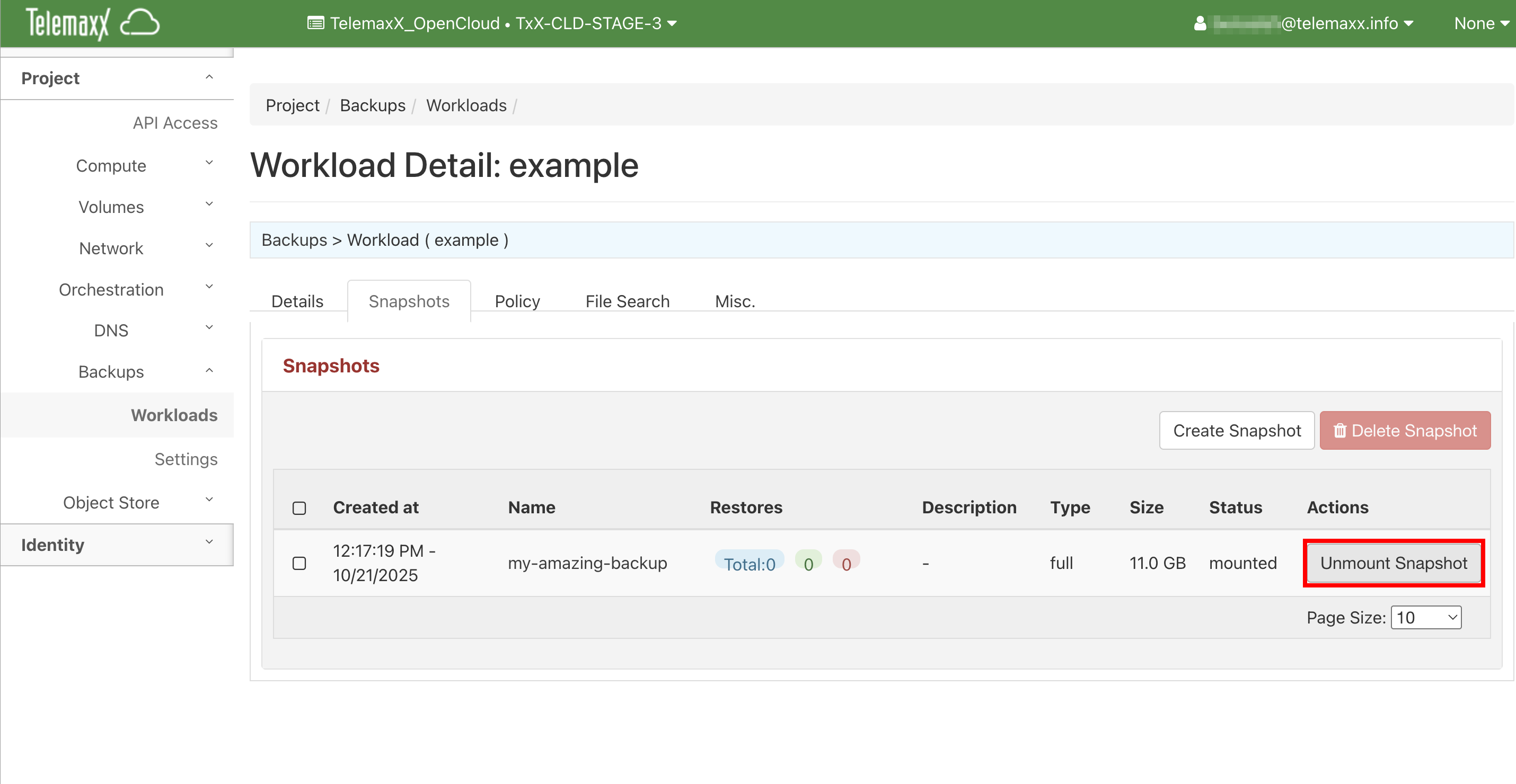 Wählen Sie wieder den entsprechenden Workload aus und navigieren in den Reiter Snapshots.