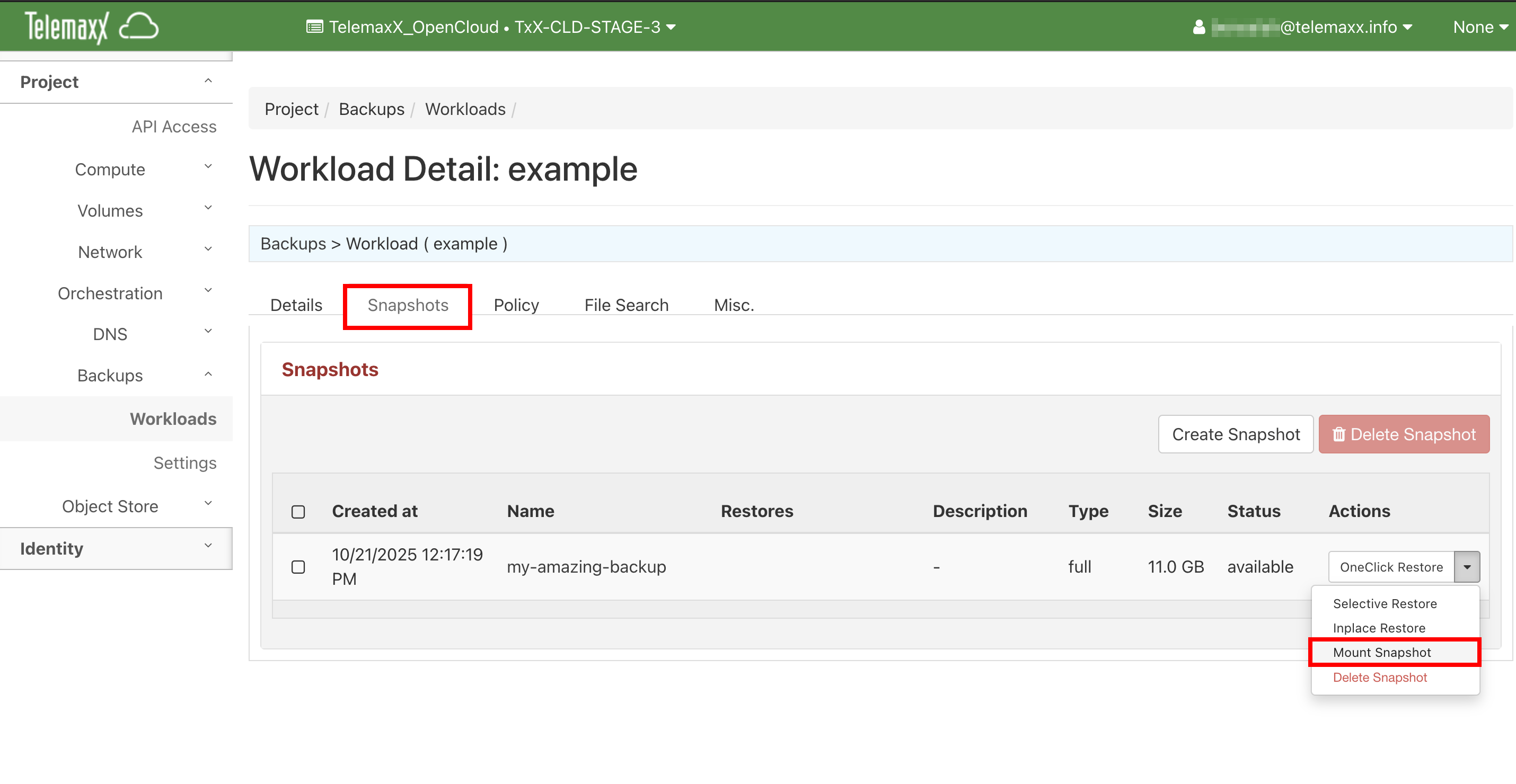 Wählen Sie aus der Liste das gewünschte Snapshot aus, öffnen Sie rechts das Dropdown-Menü und wählen Sie die Aktion Mount Snapshot aus.