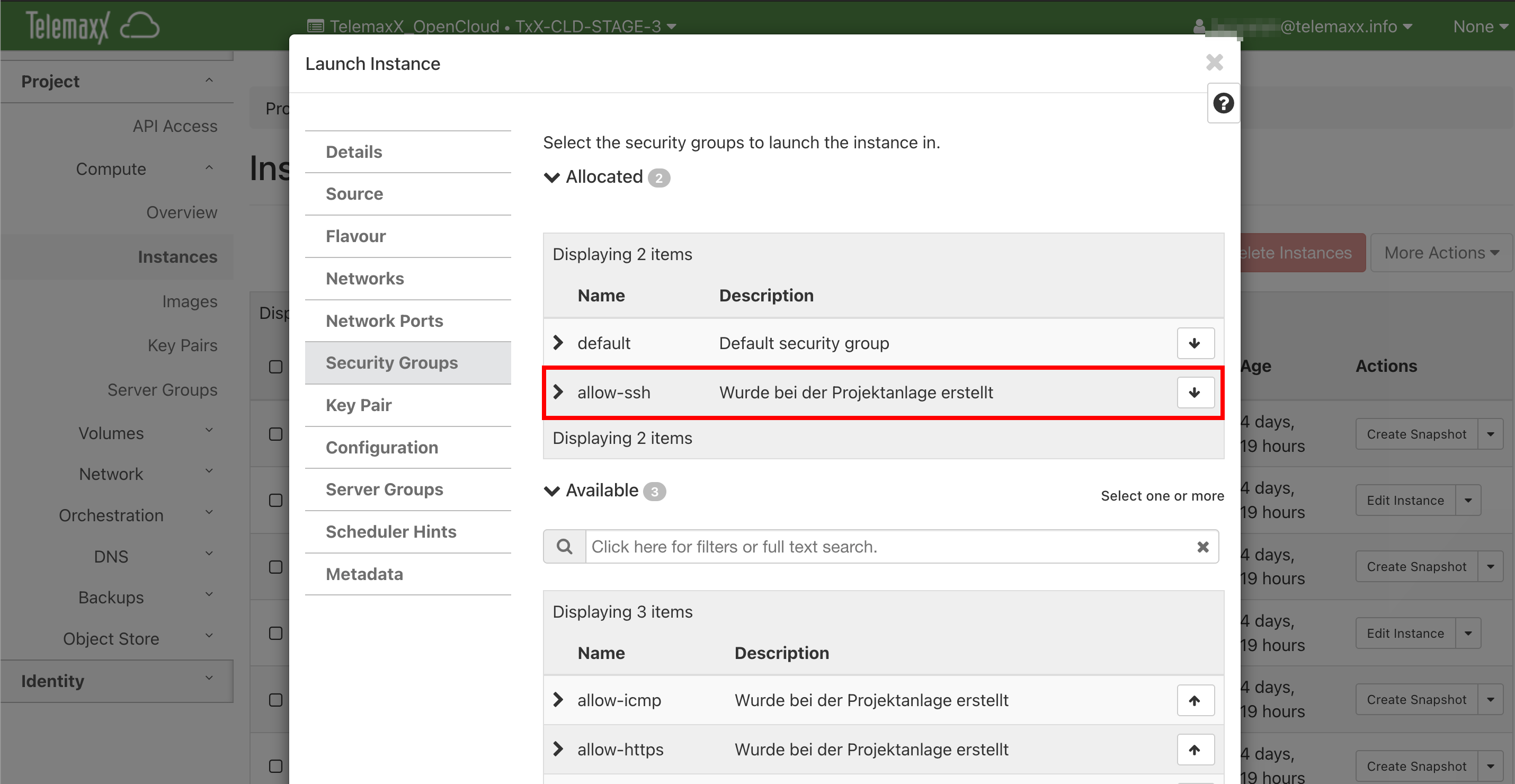 Um später via SSH auf die Recovery-VM zuzugreifen, muss der entsprechende Port über Security Groups freigegeben werden.