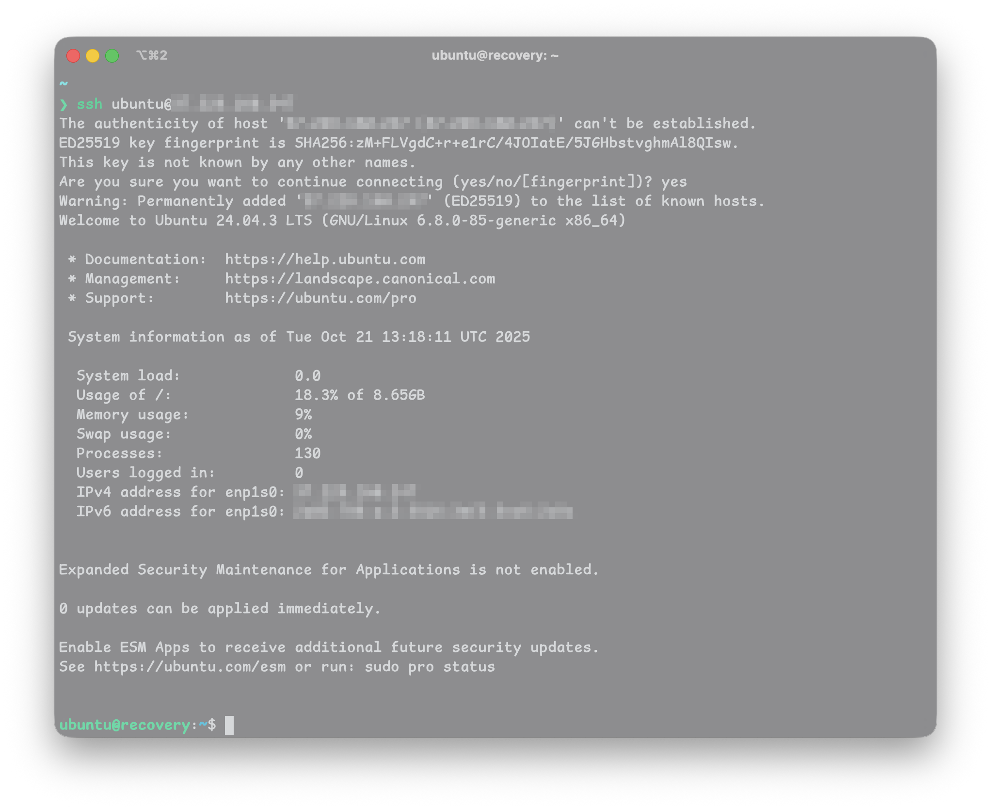 Sobald der Status auf mounted wechselt, können Sie sich per SSH auf die Recovery-VM einloggen und anschließend auf die Daten des Backups zugreifen. Dazu verbinden Sie sich von einem beliebigen SSH-fähigen Terminal wie folgt: