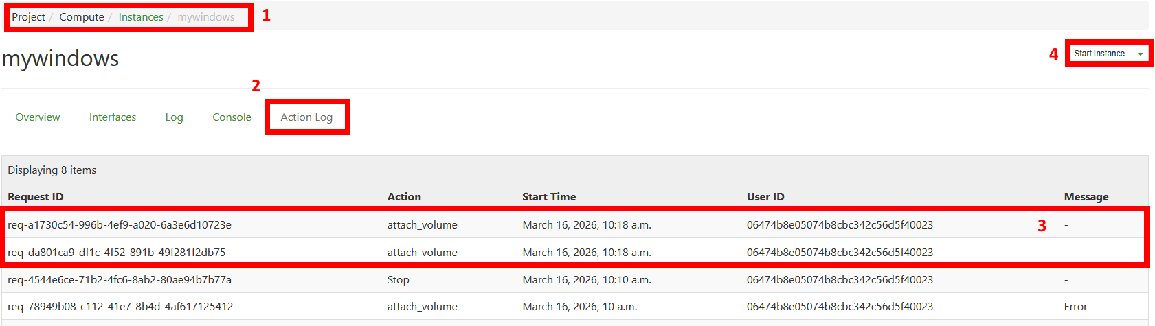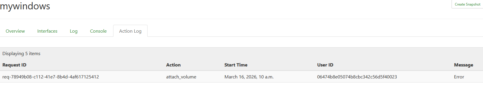 Navigieren sie zurück zu ihrer Windows-Instanz, sollten im Bereich Action Log die Request-Vorgänge erfolgreich abgeschlossen sein.