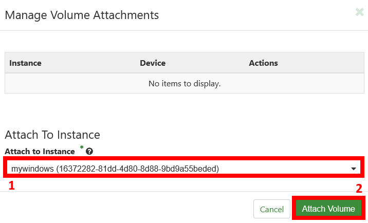 Sobald sie "Manage Attachements" ausgewählt haben, erscheint der folgende Dialog. Hier wählen sie bitte die heruntergefahrene Windows-Instanz aus, welche das Volume erhalten soll und bestätigen mit "Attach Volume"