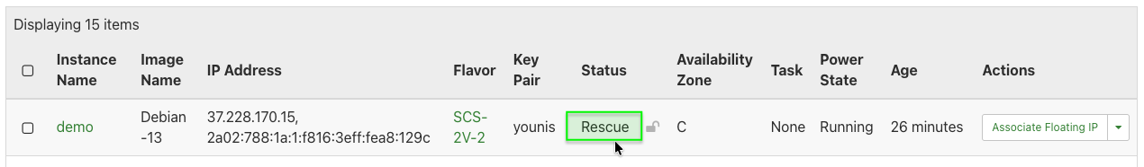 openstack server show VM-NAME-ODER-IDDer Status sollte anschließend auf RESCUE stehen.openstack server show my-server-01 +--------+--------------------------------------+ | Field | Value | +--------+--------------------------------------+ | id | 04f4b416-c8e7-4aa2-a451-78513e0cd0ff | | name | my-server-01 | | status | RESCUE | +--------+--------------------------------------+