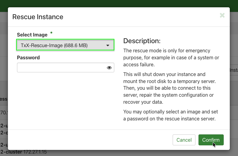 openstack server rescue --image TxX-Rescue-Image VM-NAME-ODER-IDopenstack server rescue --image TxX-Rescue-Image my-server-01 - Status prüfen