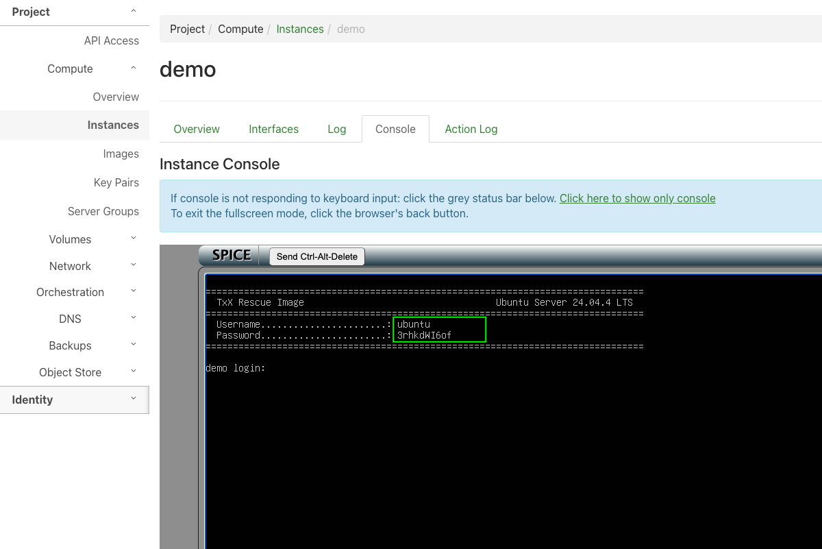 Der Login erfolgt über die Konsole der VM in der Horizon-Weboberfläche.