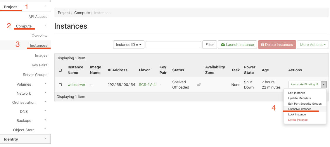 Horizon -> Project -> Compute -> Instances -> Dropdown Menü -> unshelve Instance