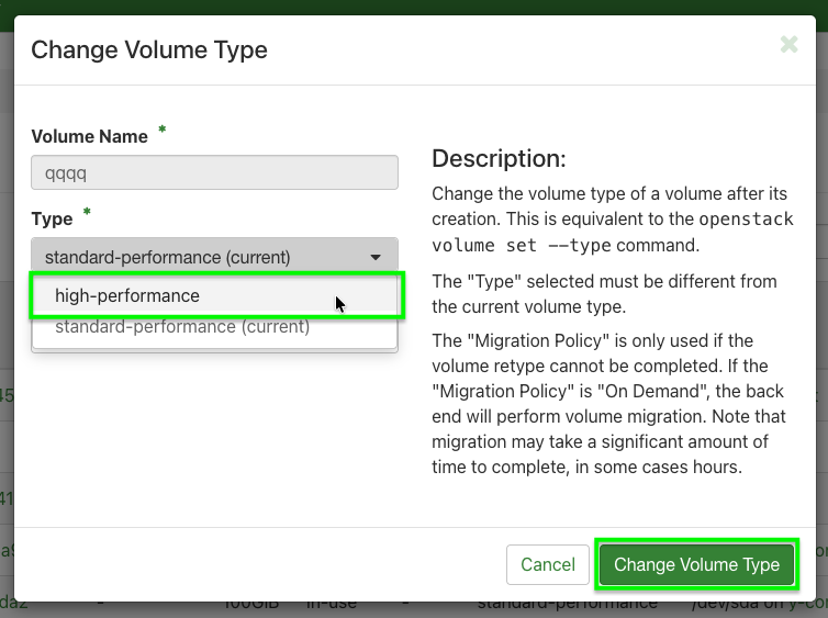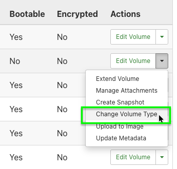Unter Project → Volumes → Volumes das Volume auswählen und im Dropdown-Menü die Aktion Change Volume Type auswählen.
