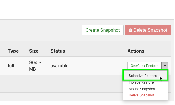 Sobald der Snapshot den Status available erreicht hat, kann über das Dropdown-Menü die Aktion Selective Restore ausgewählt werden.