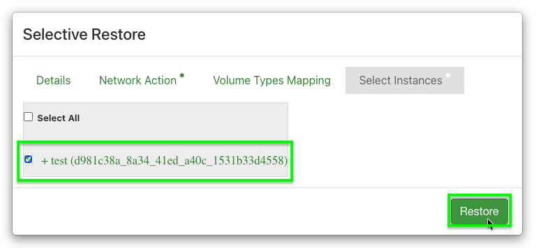 Im Reiter Select Instances wählen Sie die wiederherzustellende VM aus und bestätigen mit Klick auf Restore.