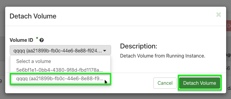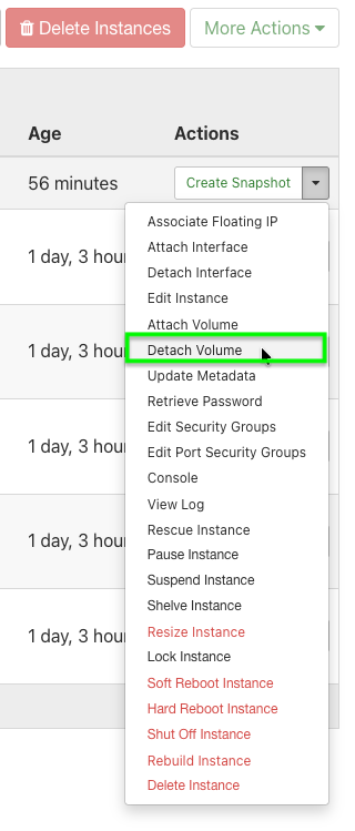 Im Dropdown-Menü die Aktion Detach Volume auswählen.