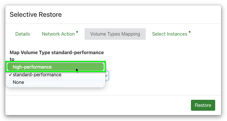 Wählen Sie anschließend im Reiter Volume Types Mapping den gewünschten Volume-Type – hier beispielhaft high-performance.
