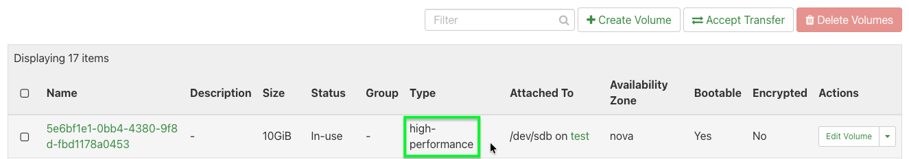 Sobald der Vorgang erfolgreich abgeschlossen ist, können Sie sich unter Project → Volumes → Volumes davon vergewissern, dass das neue Volume den gewünschten Typ aufweist.