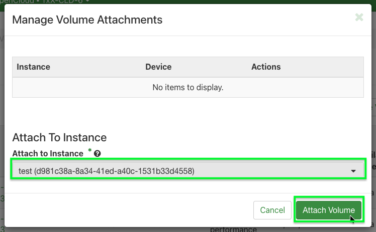 Alternativ kann das Volume auch über die Aktion Attach Volume im Dropdown-Menü der VM unter Project → Compute → Instances angehängt werden.
