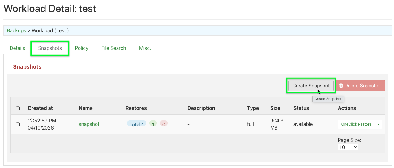 Sobald der Workflow erzeugt wurde, können darüber Backups (Snapshots) erzeugt werden. Klicken Sie dazu auf den Workflow in der Liste, wechseln Sie anschließend in den Reiter Snapshots.