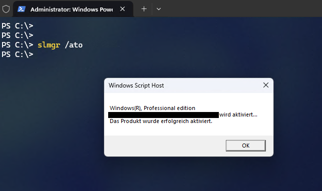 Sobald Windows aktiviert wurde, erhalten sie eine entsprechende Rückmeldung.